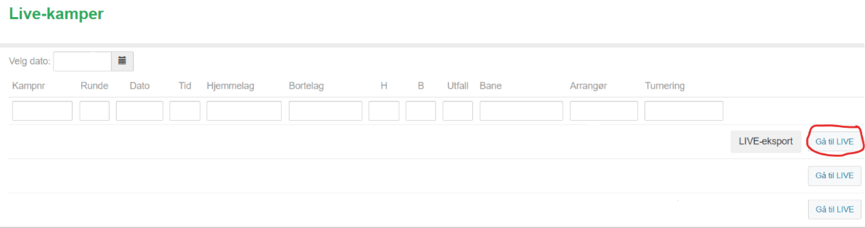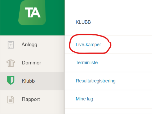 3. Gå til Live registrering - Får deg videre til der digital kamprapport føres.